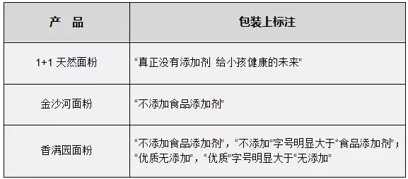 常見(jiàn)面粉品牌中,1+1、金沙河、香滿園等外包裝上,都印有與“沒(méi)有添加劑”相關(guān)的字樣。